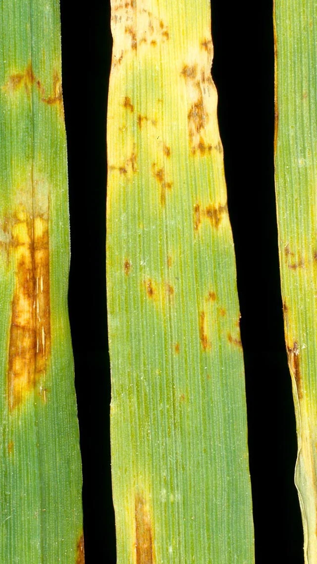 The first symptoms are very small, dark brown lesions on the leaves. These develop into short brown stripes or irregular blotches which, on close examination, are seen to consist of a network of brown lines. The ear can also be infected but lesions do not usually appear.