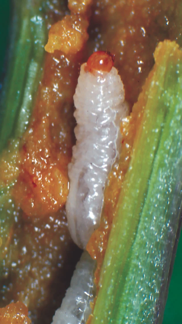 The main shoots or whole plants can be killed by the larvae tunnelling and feeding in the stems. In the spring, at the beginning of stem extension, plants remain stunted and produce lateral shoots and the larvae can be found feeding in the stems when cut open.