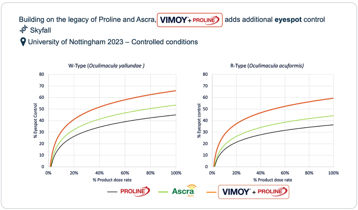 7 trials, 2023. Septoria (T2): 5 trials, 2023. Yellow rust (T1): 9 trials, 2021-23. Brown rust (T2): 5 trials, 2021-23. Eyespot (T1): 1 trial, 2023. University of Nottingham. For eyespot values for Elatus® Era and Univoq® are derived from the prothioconazole component of the product as neither Solatenol® or fenpicoxamid have recognised activity against eyespot.