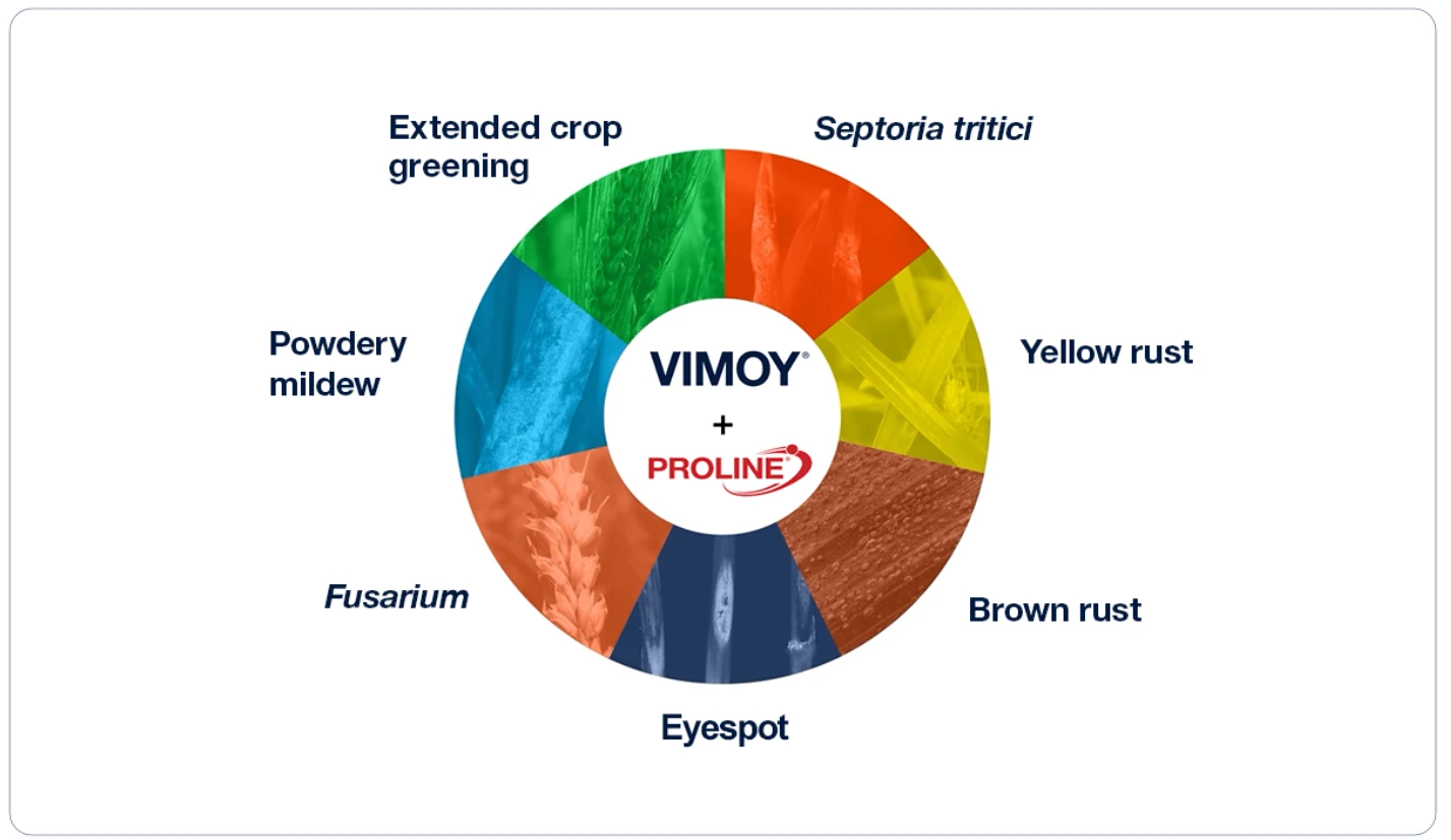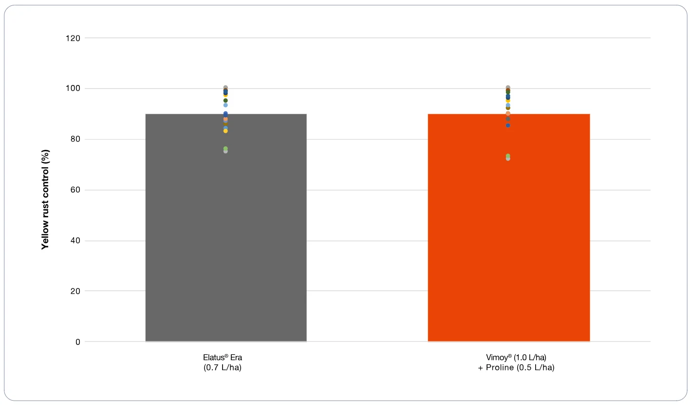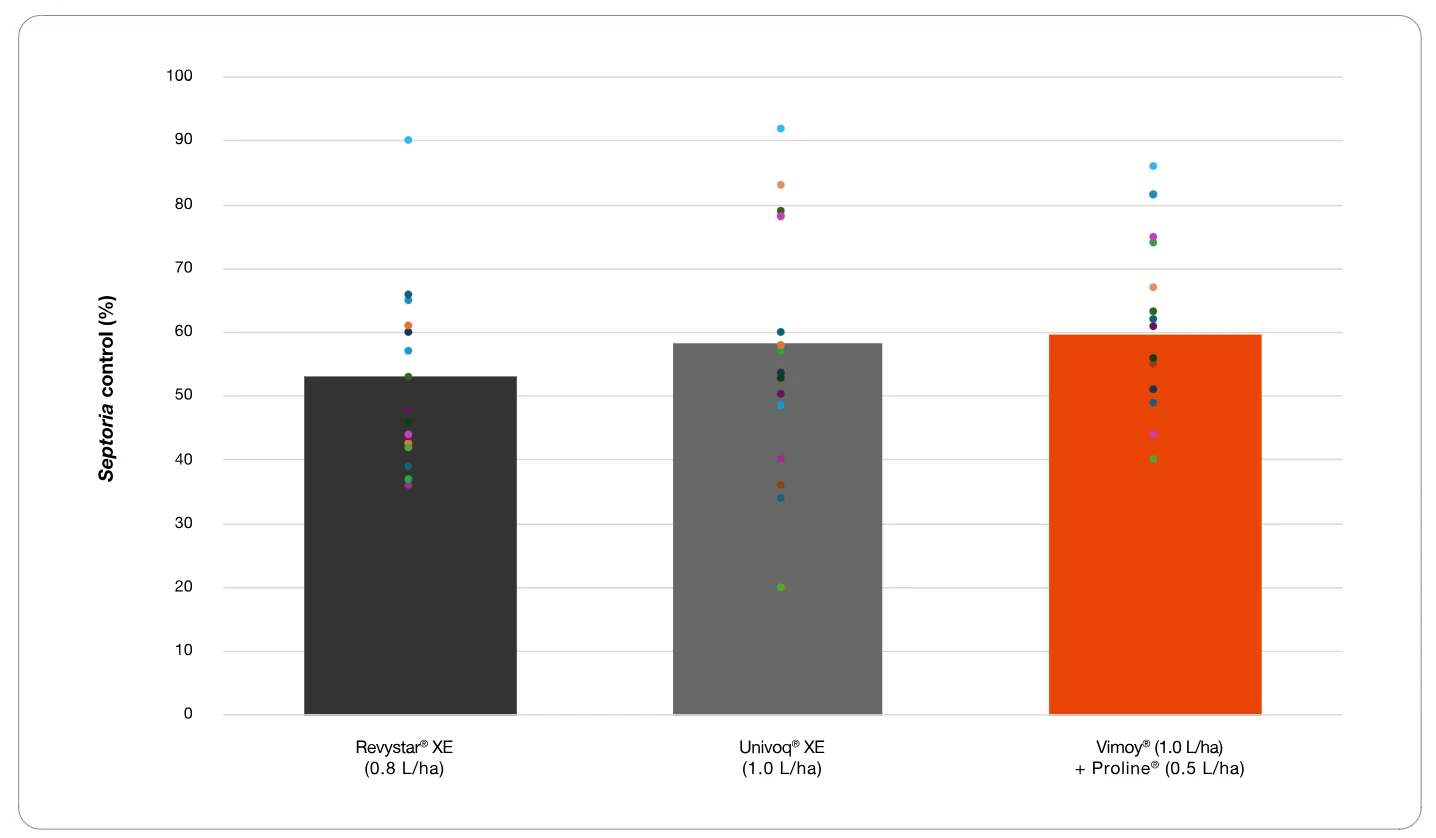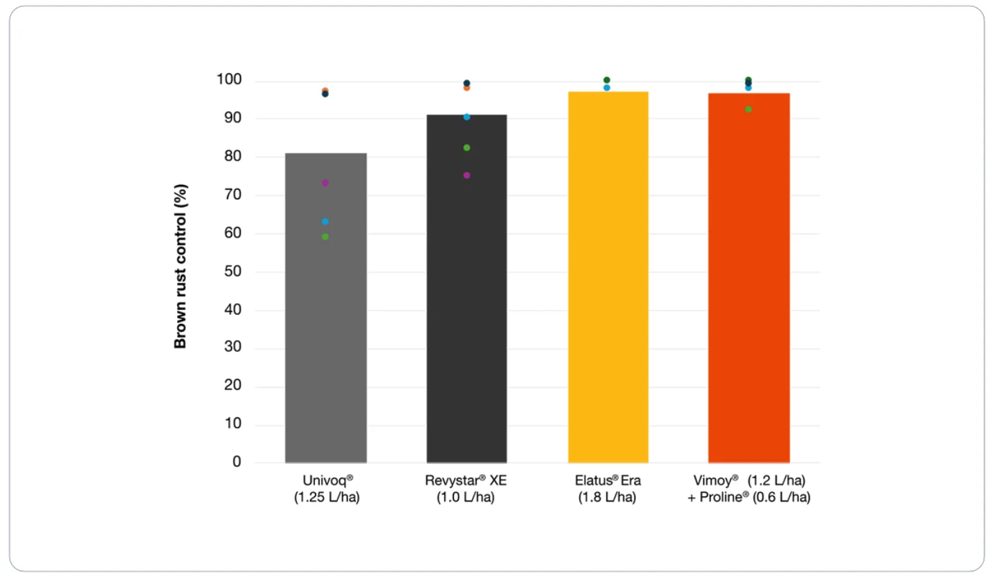 Bayer, 2021-23. Oversprays at T1, no T3. Programmes uniform within trials, not across trials. Univoq®: 5 trials. Revystar®: 5 trials. Elatus® Era: 3 trials. Vimoy® + Proline®: 6 trials.