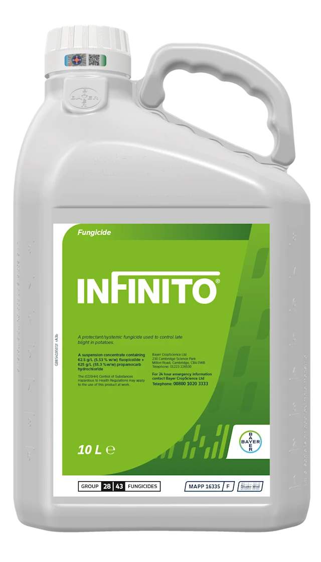 Infinito is a co-formulation of fluopicolide and propamocarb; active substances which work together to protect every part of the potato plant – leaves, stems, tips and tubers – and attack the late blight pathogen at every stage of its life cycle. This performance is recognised in the EuroBlight rating for effectiveness against foliar blight, tuber blight and anti-sporulant efficacy.